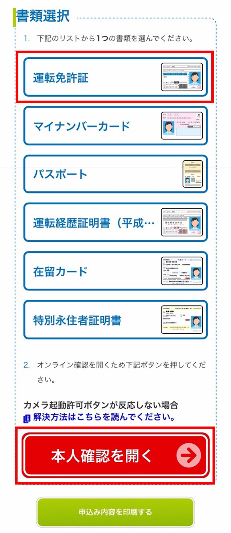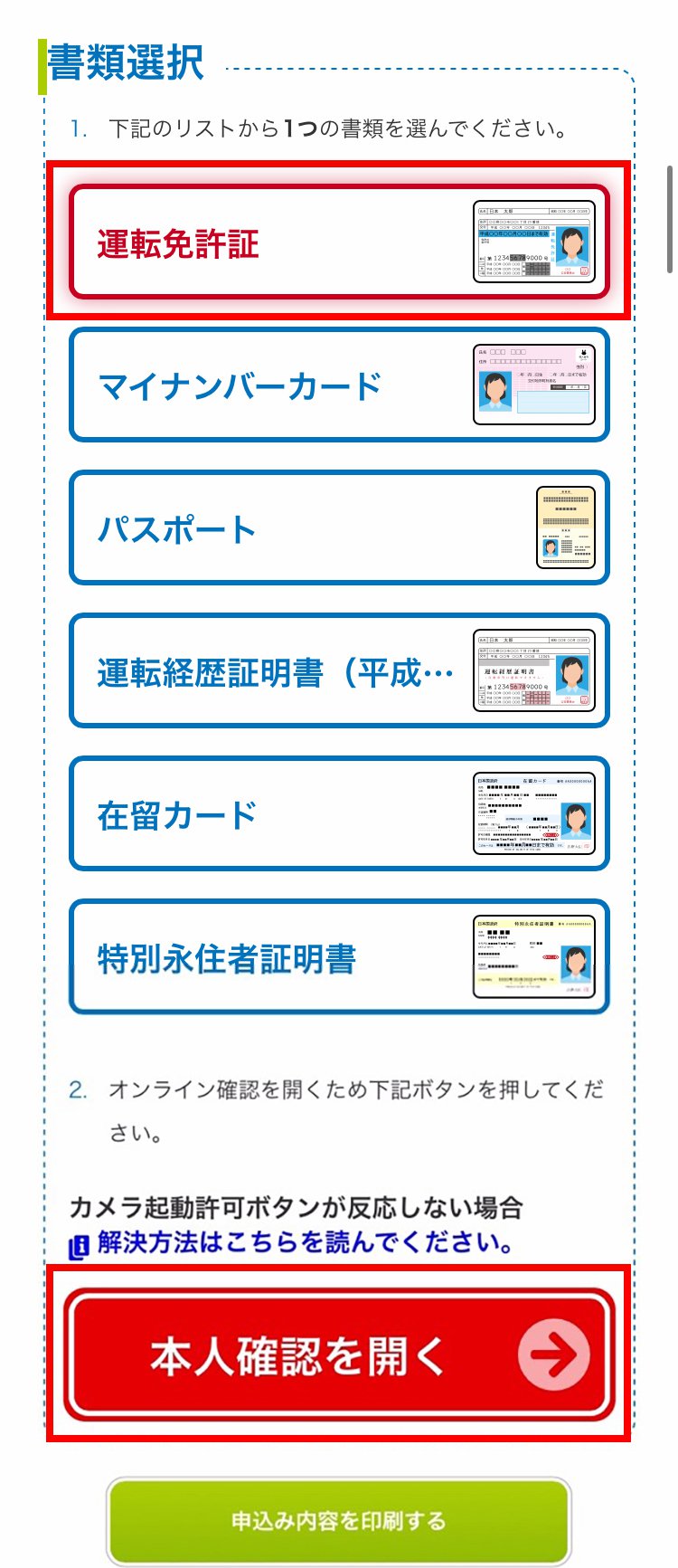 利用する本人確認書類を選択して、本人確認を開くをタップします。