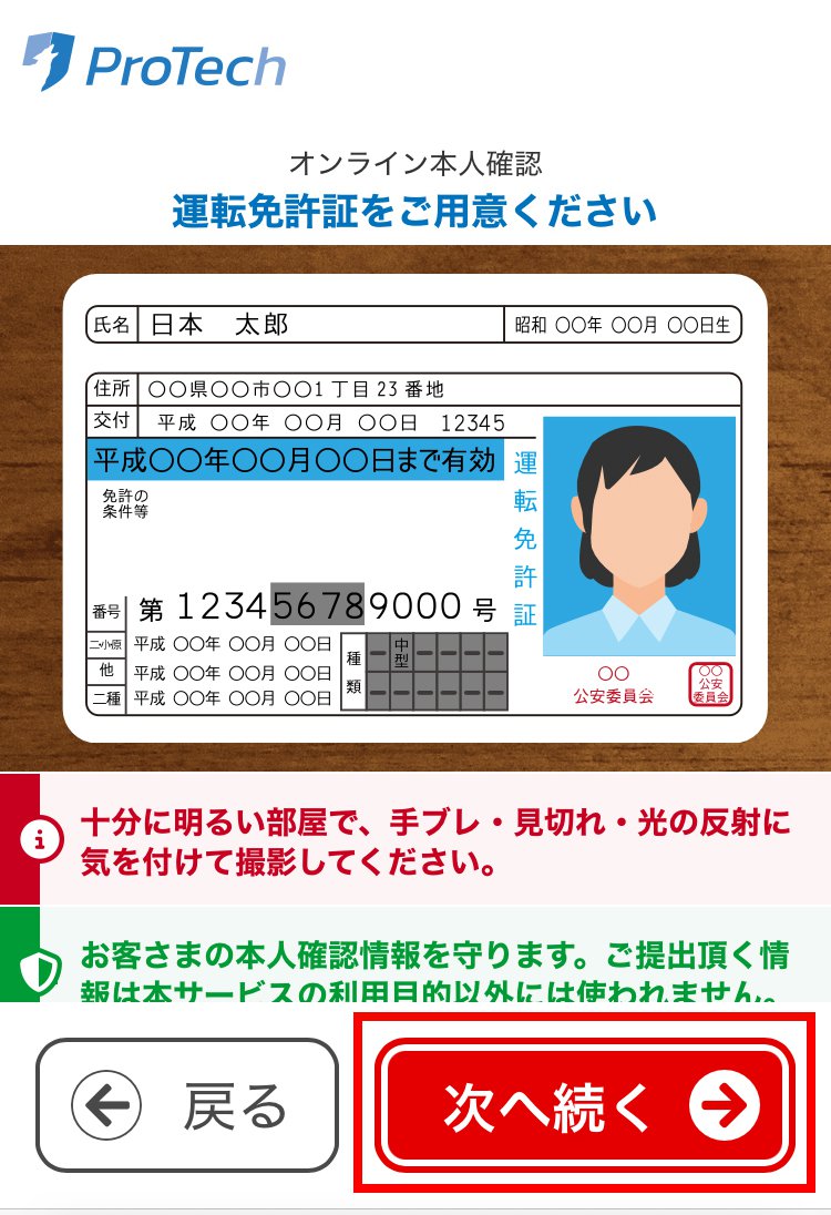 選択した本人確認書類が表示されていることを確認して、次へ続くをタップします。
