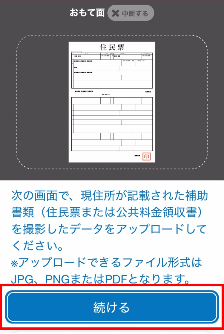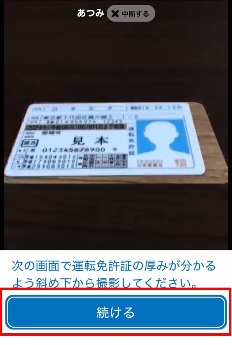 案内に従って、本人確認書類のあつみを撮影します。続けるをタップします。