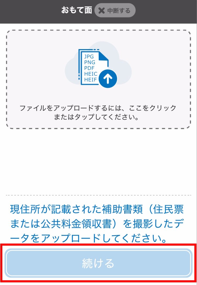 現住所が記載された補助書類(住民票または公共料金領収書)を撮影したデータをアップロードしてください。