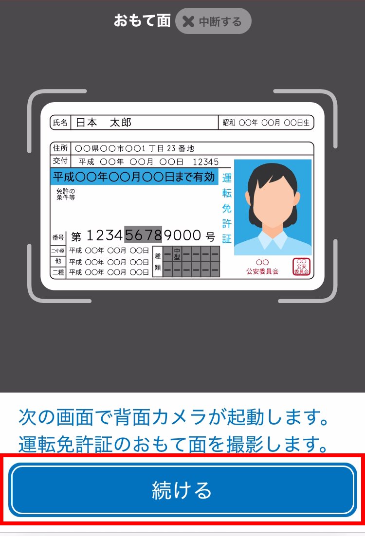 案内に従って、本人確認書類のおもて面を撮影します。続けるをタップします。