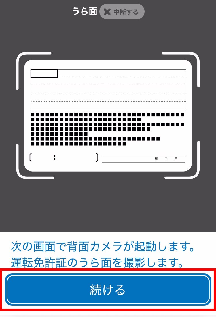 案内に従って、本人確認書類のうら面を撮影します。続けるをタップします。