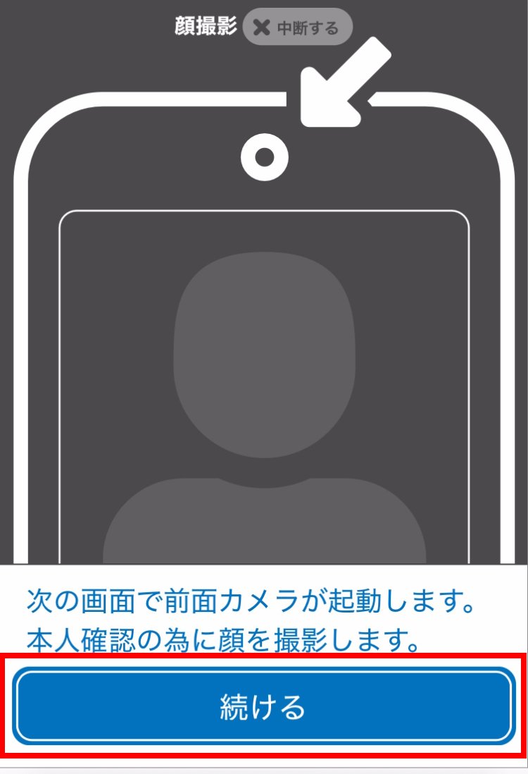 容貌撮影を行います。案内事項を確認して、続けるをタップします。