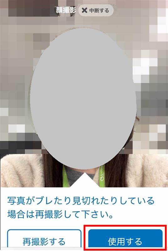 撮影画像を確認して、問題なければ使用するをタップします。撮り直したい場合は、再撮影するをタップします。③で記載ありを選択した場合は、⑭へ進みます。