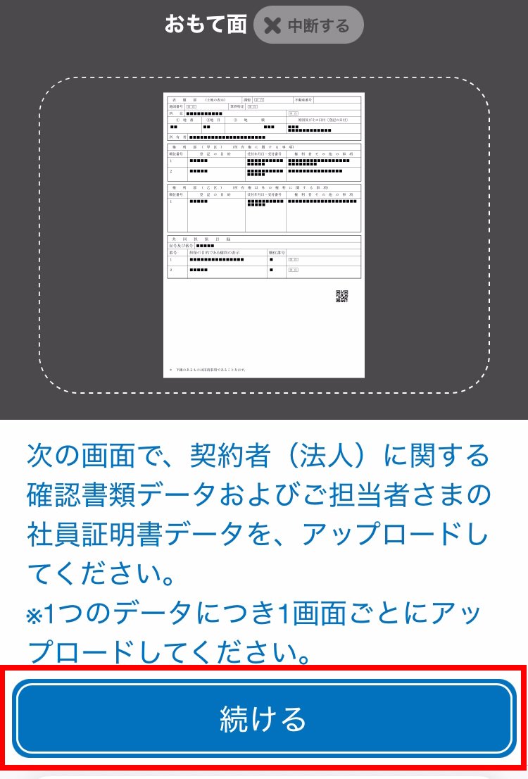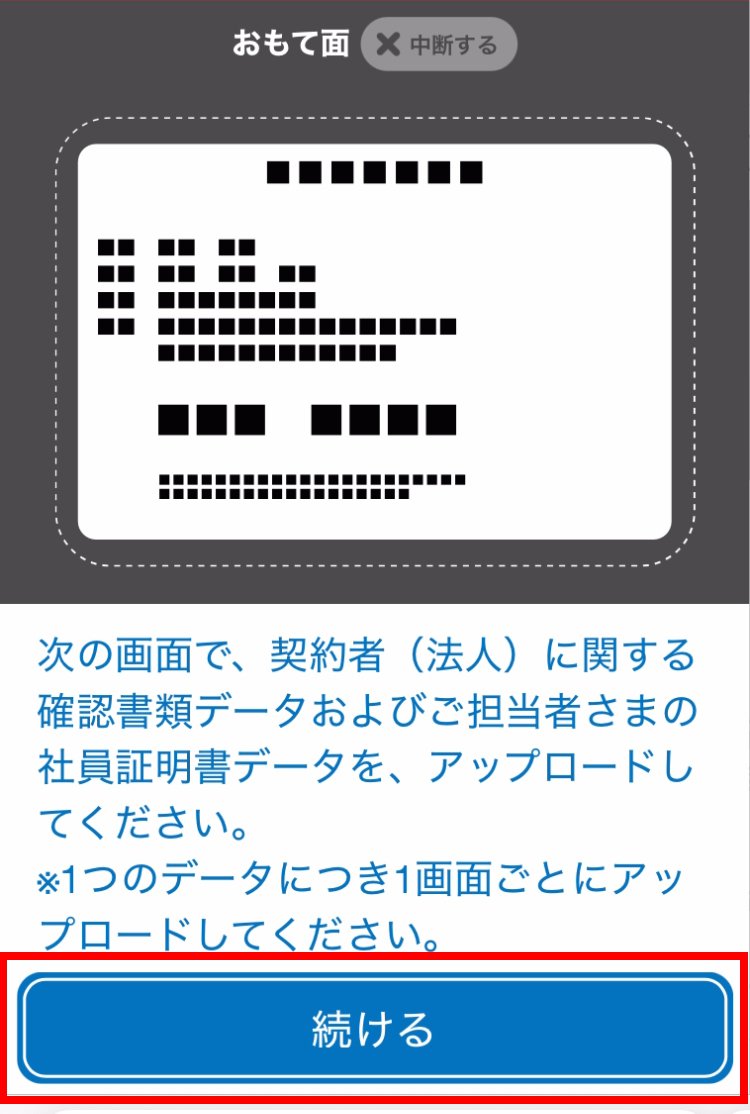 契約者(法人)に関する確認書類データをアップロードします。案内事項を確認し、続けるをタップします。